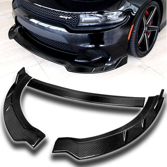 2015-2023 Dodge Charger Real Carbon Fiber 3-Piece Front Bumper Body Spoiler Splitter Lip Kit with Metal Emblem Set