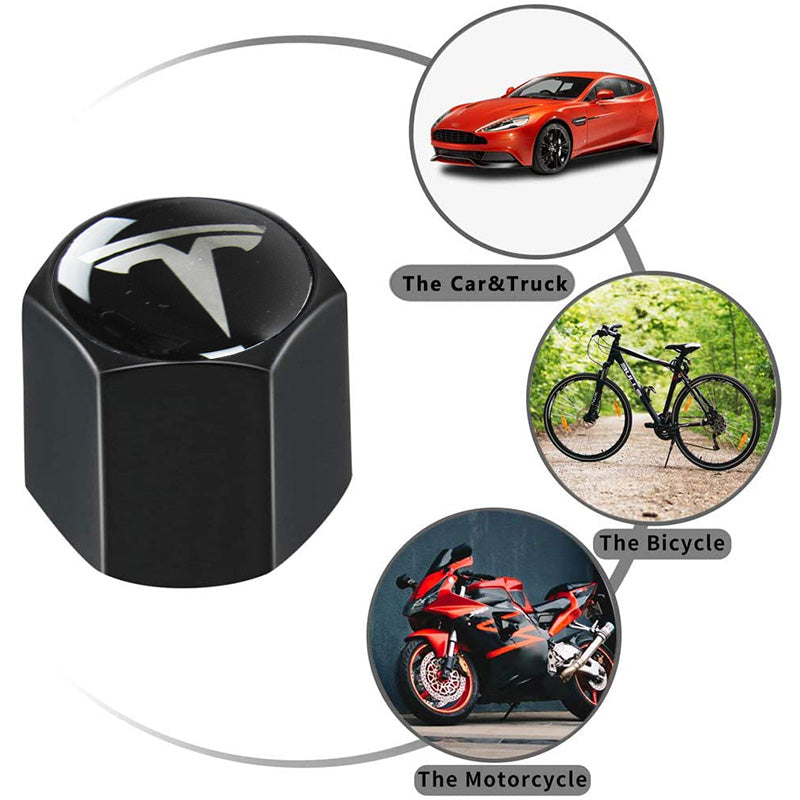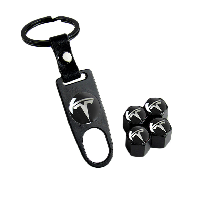 TESLA Universal Car SUV Wheel Tire Valves Dust Stem Air Caps Keychain Emblem Black Set