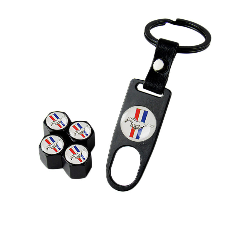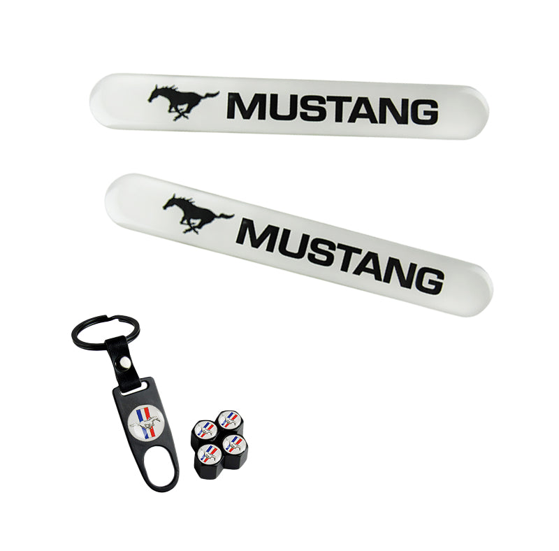 Ford Mustang Set LOGO Emblems with Black Keychain Wheel Tire Valves Air Caps - US SELLER