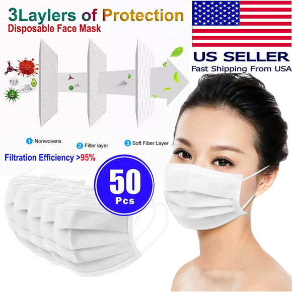 50 PCS Face Mask Non Medical Surgical Disposable 3Ply Earloop Mouth Cover - White (with Box)