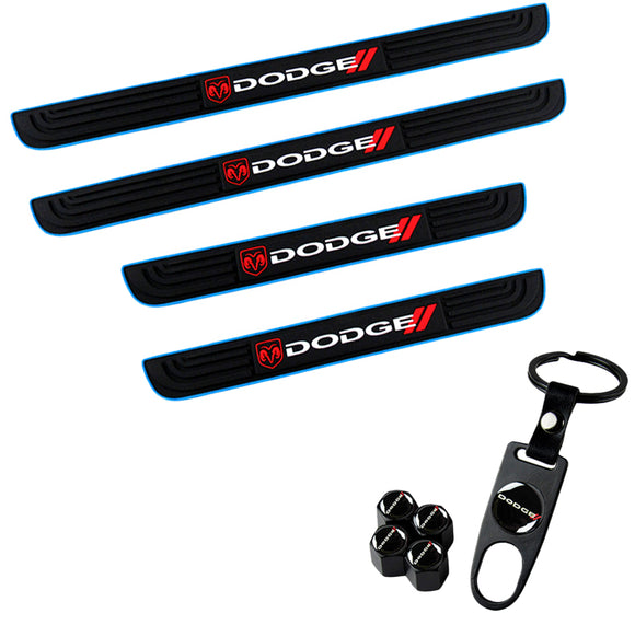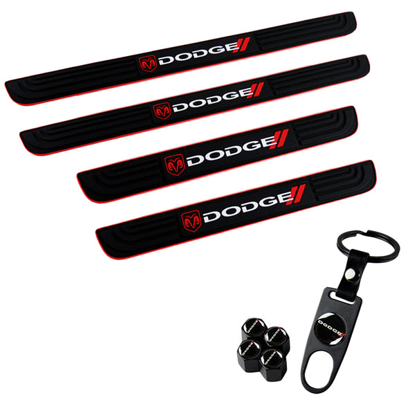 DODGE Set 4PCS Car Door Rubber Scuff Sill Panel Step Protector with Wheel Tire Valves Dust Stem Air Caps Keychain