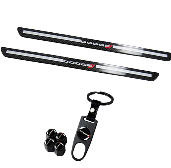 DODGE Set Carbon Car Door Scuff Sill Panel 2PCS Step Protector with Keychain Wheel Tire Valves Dust Stem Air Caps