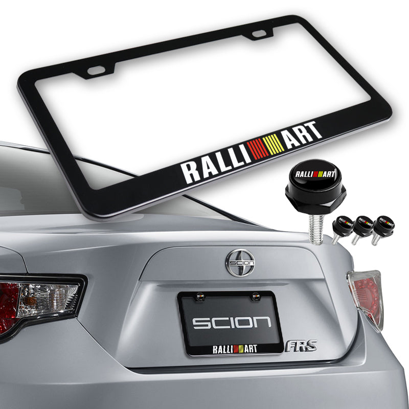 New Ralliart 2 pcs Black Stainless Steel License Plate Frame with Caps Bolt Screw Set