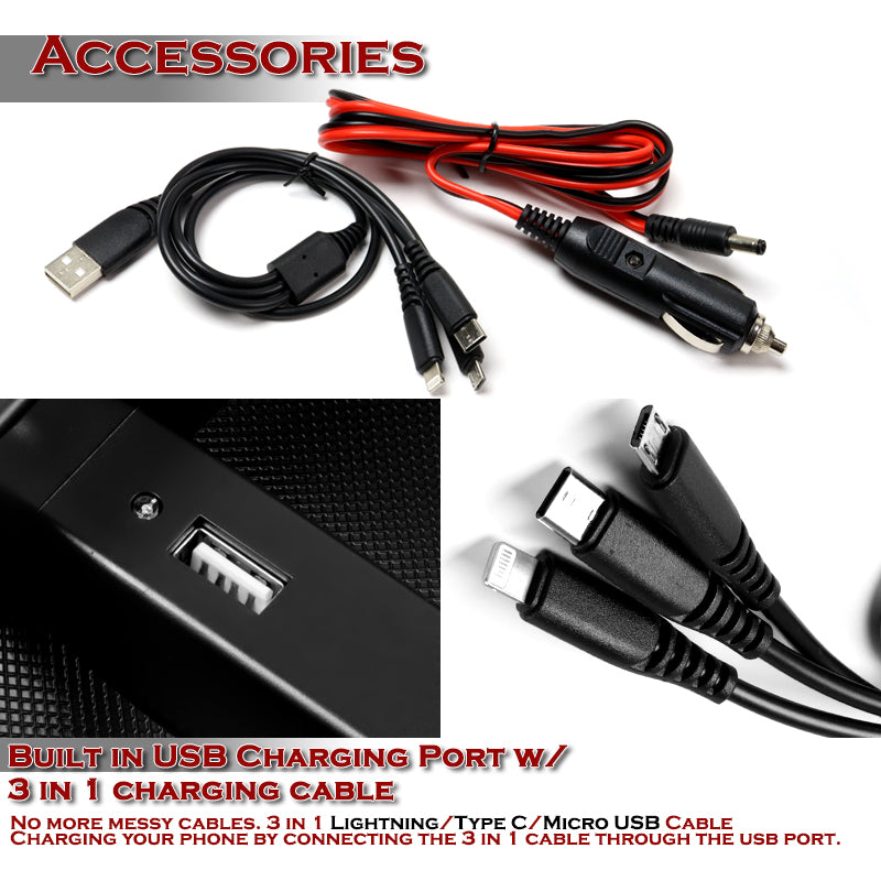 Includes 1 USB port and a 20” 3-in-1 charging cable for multiple devices simultaneously.