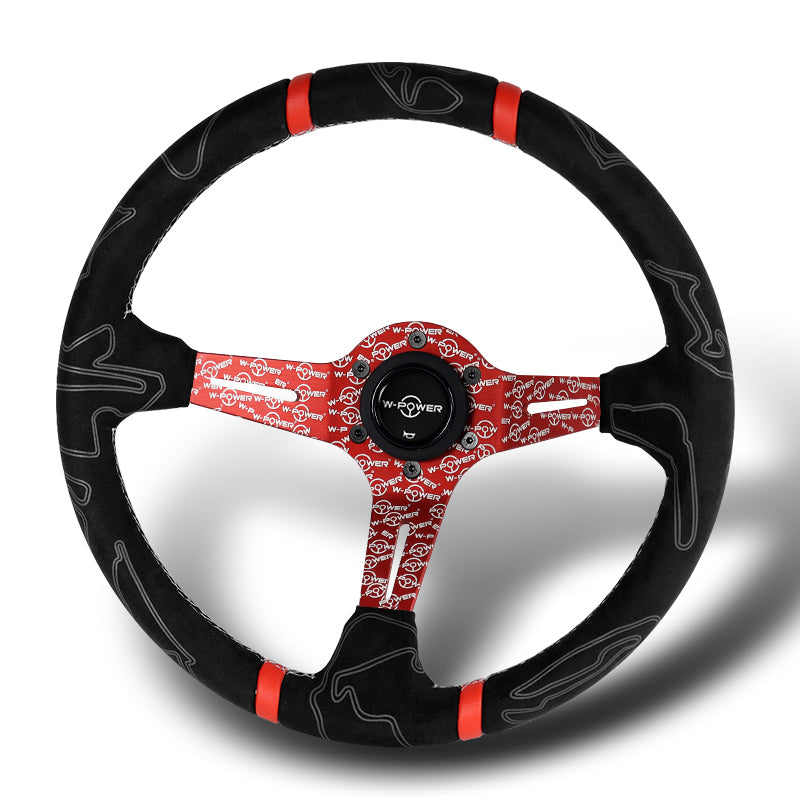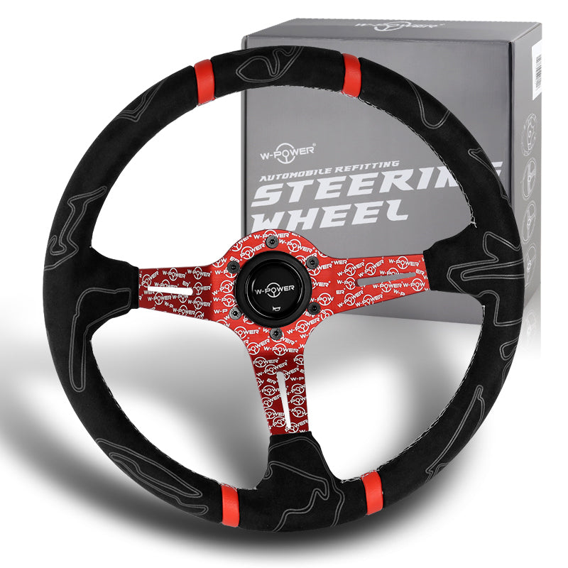 W-Power 350mm 14" Black Alcantara Grip Red Anodized 3-Spoke Double Red Center Stripes 4" Deep Dish Ultra Street Steering Wheel