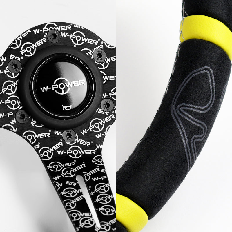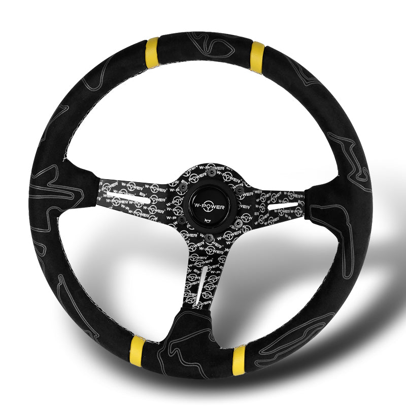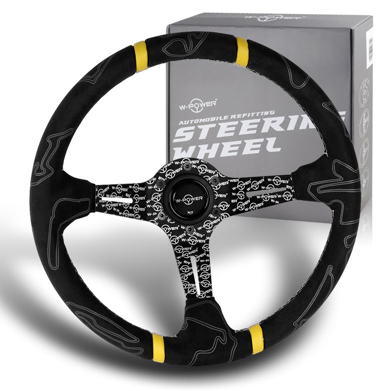 W-Power 350mm 14" Black Alcantara Grip Yellow Anodized 3-Spoke Double Yellow Center Stripes 4" Deep Dish Ultra Street Steering Wheel