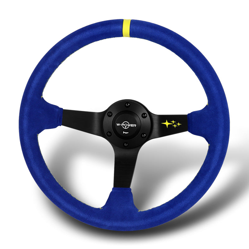 W-Power 350mm 14" Premium Blue Suede With Yellow Strip Grip Aluminum Finished 3-Spoke 4" Deep Dish JDM Euro VIP Style Steering Wheel -Blue Suede/Yellow Strip
