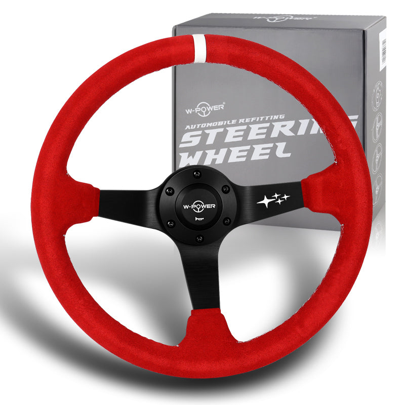 W-Power 350mm 14" Premium Red Suede With White Strip Grip Aluminum Finished 3-Spoke 4" Deep Dish JDM Euro VIP Style Steering Wheel -Red Suede/White Strip