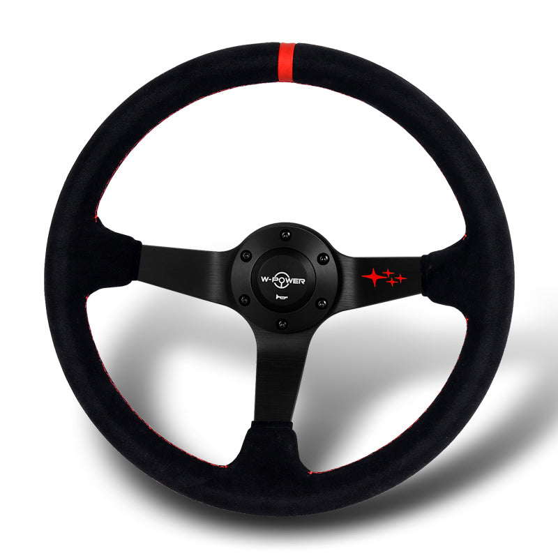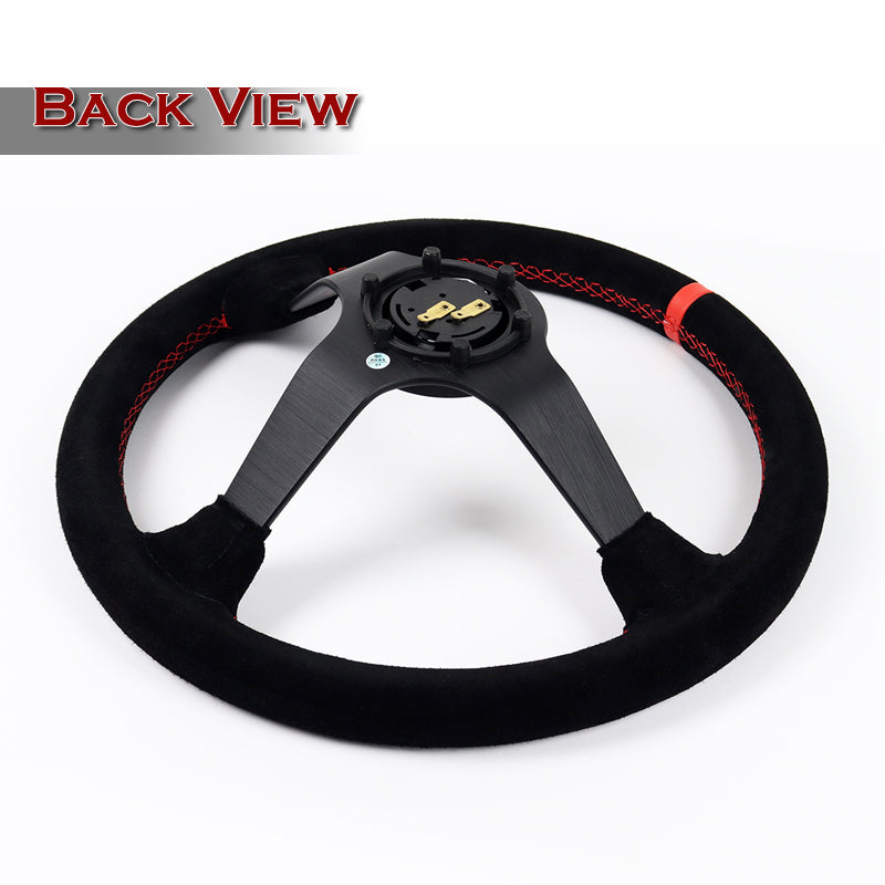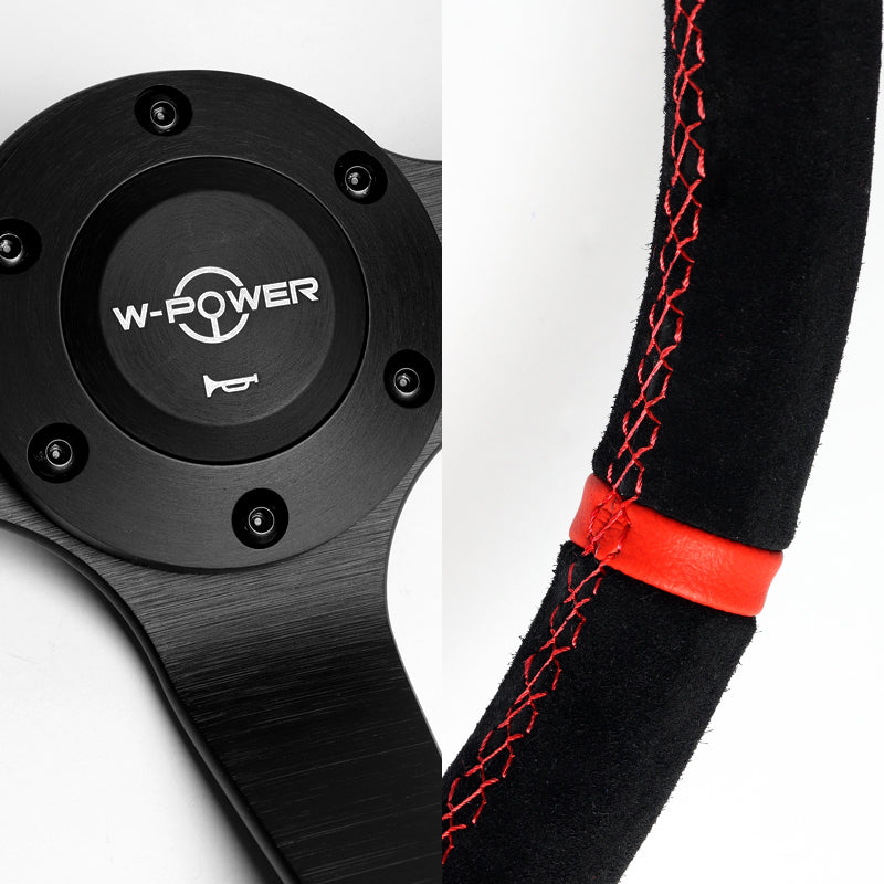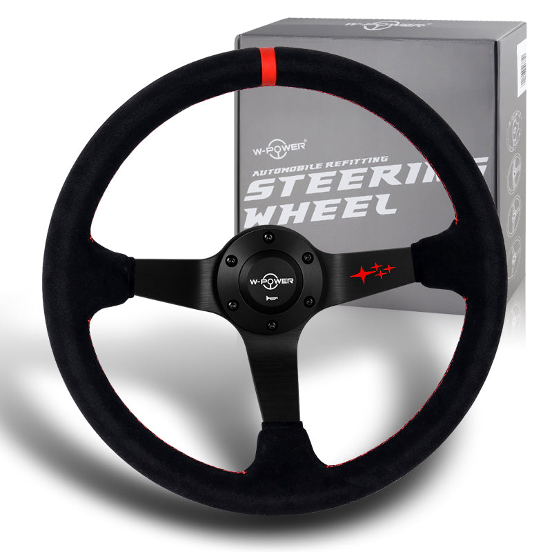 W-Power 350mm 14" Premium Suede With Red Strip Grip Aluminum Finished 3-Spoke 4" Deep Dish JDM Euro VIP Style Steering Wheel -Black Suede/Red Strip