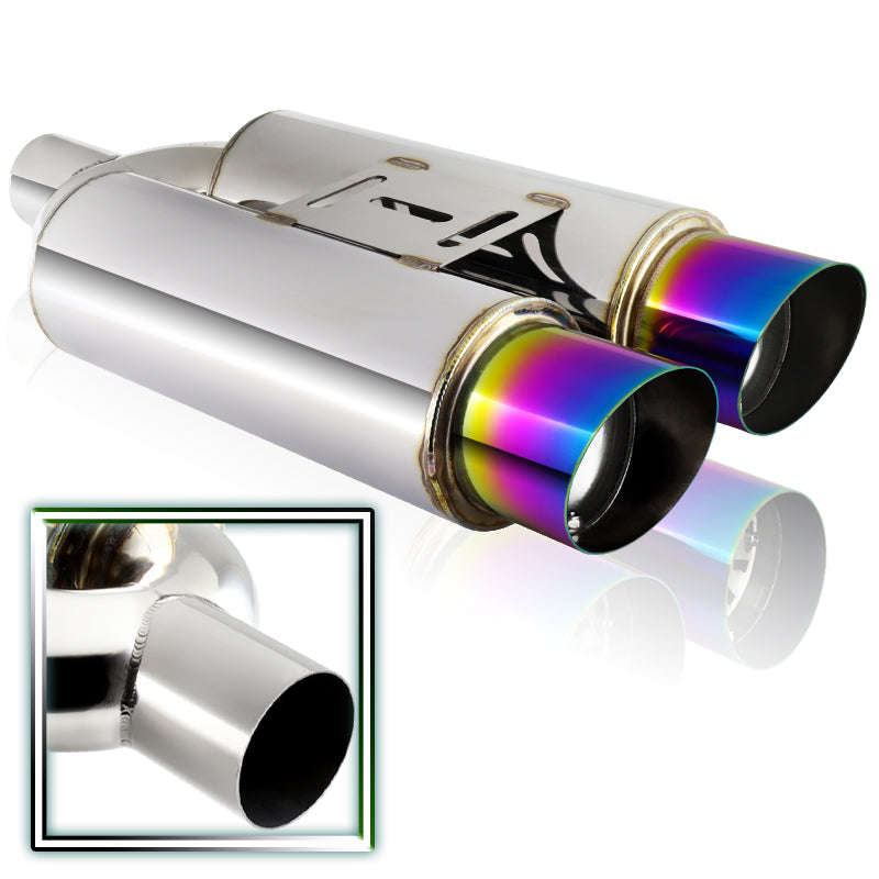 DTM Dual Body Slant Tip Style Universal 2.5" Inlet 3.5" Outlet Deep And Smooth Tone, Removable Silencer Pre-attached, Weld-On T-304 Exhaust High Flow Dual Tip Muffler -Rainbow Burnt Tip