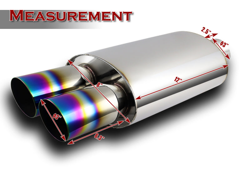 DTM Dual Slant Tip Style Universal 3" Inlet 3" Outlet Deep And Smooth Tone Weld-On T-304 Exhaust High Flow Dual Tip Muffler -Rainbow Burnt Tip
