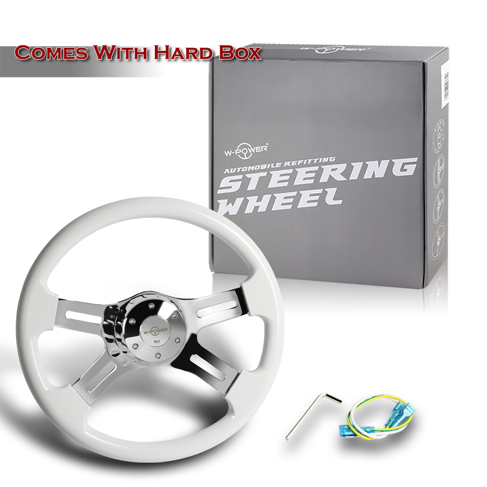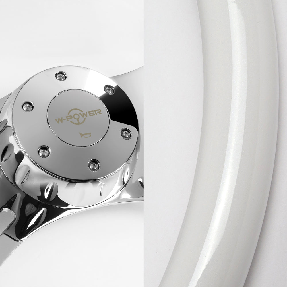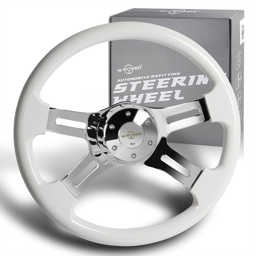 W-Power 16" 406mm 5-Bolt Hole With Aluminum Finished 4-Spoke Steering Wheel -White Wood Grip/Chrome Center Spoke