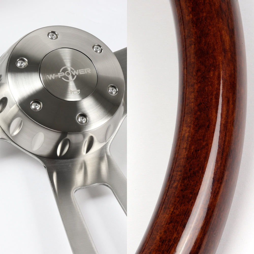 W-Power 17" 432mm 5-Bolt Hole With Aluminum Finished 3-Spoke Steering Wheel -Dark Mahogany Wood Grip/Billet Center Spoke