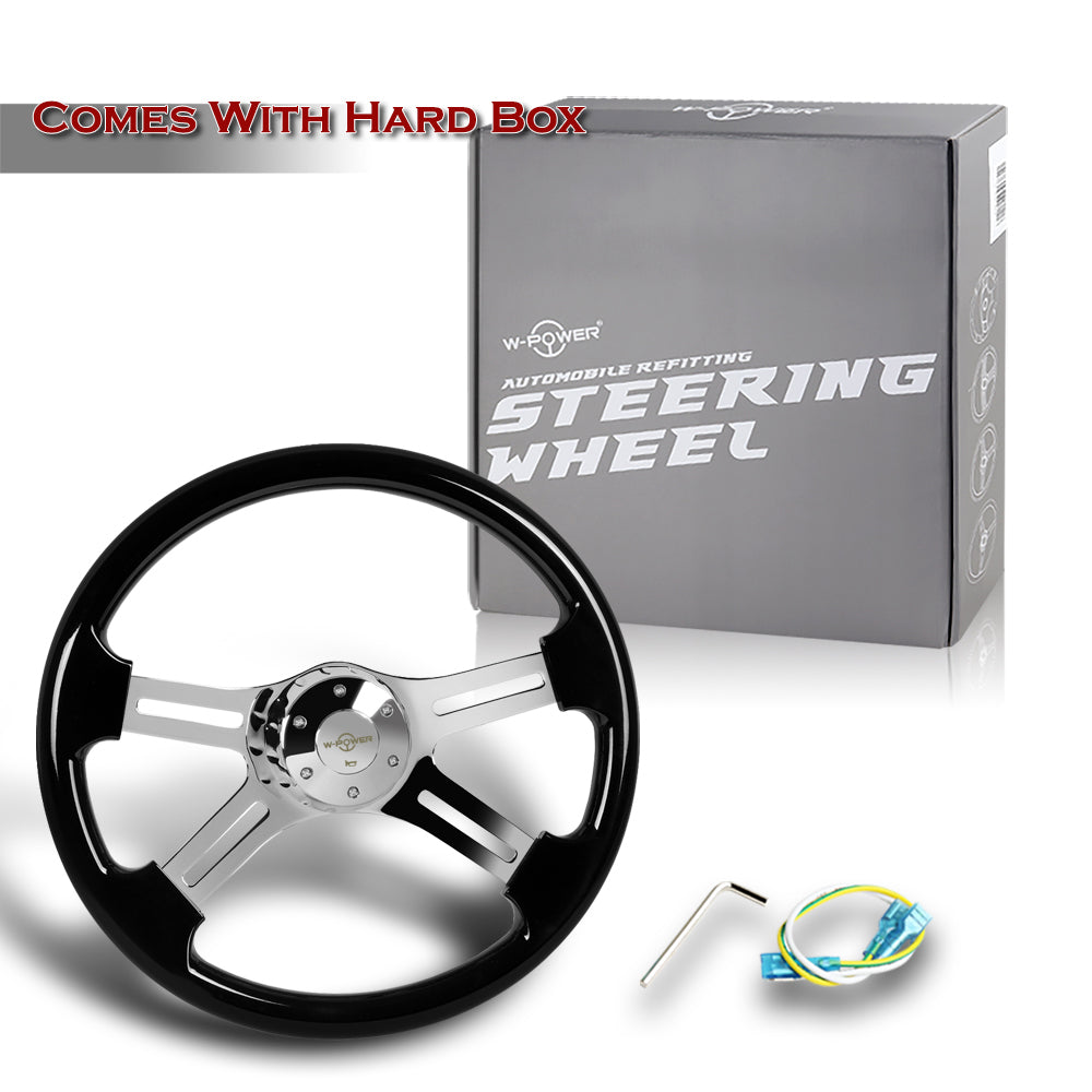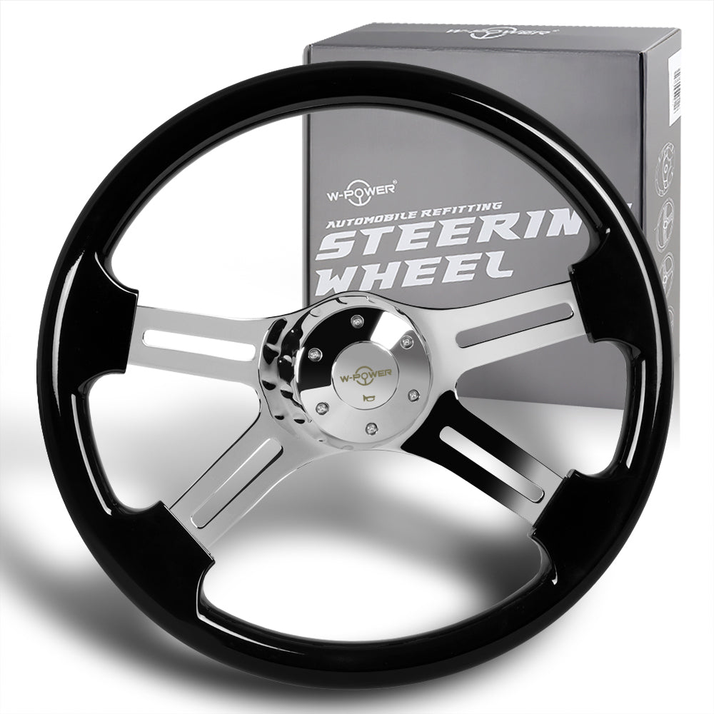 W-Power 18" 457mm 5-Bolt Hole With Aluminum Finished 4-Spoke Steering Wheel -Black Wood Grip/Chrome Center Spoke
