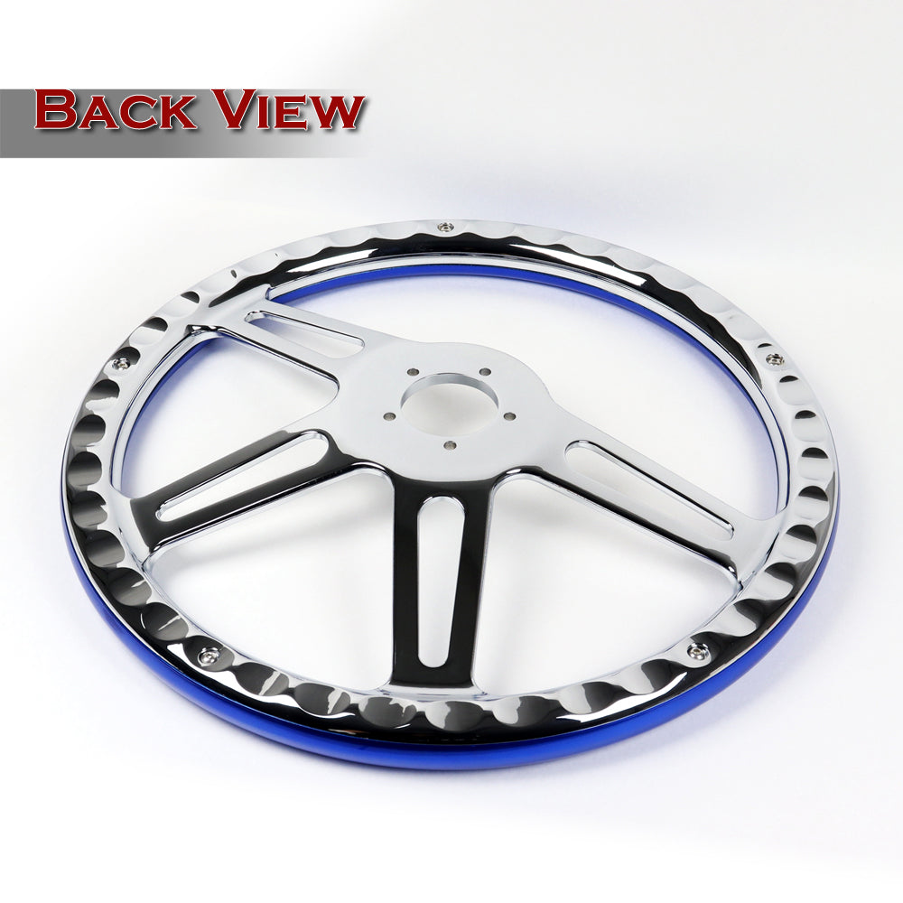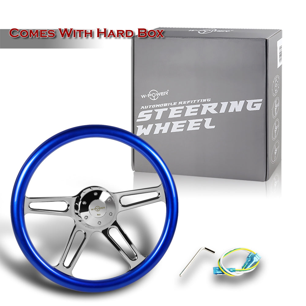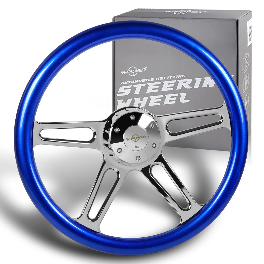 W-Power 18" 457mm 5-Bolt Hole With Aluminum Finished 4-Spoke Half Wrap Steering Wheel -Blue Wood Grip/Chrome Center Spoke