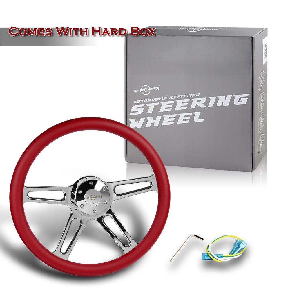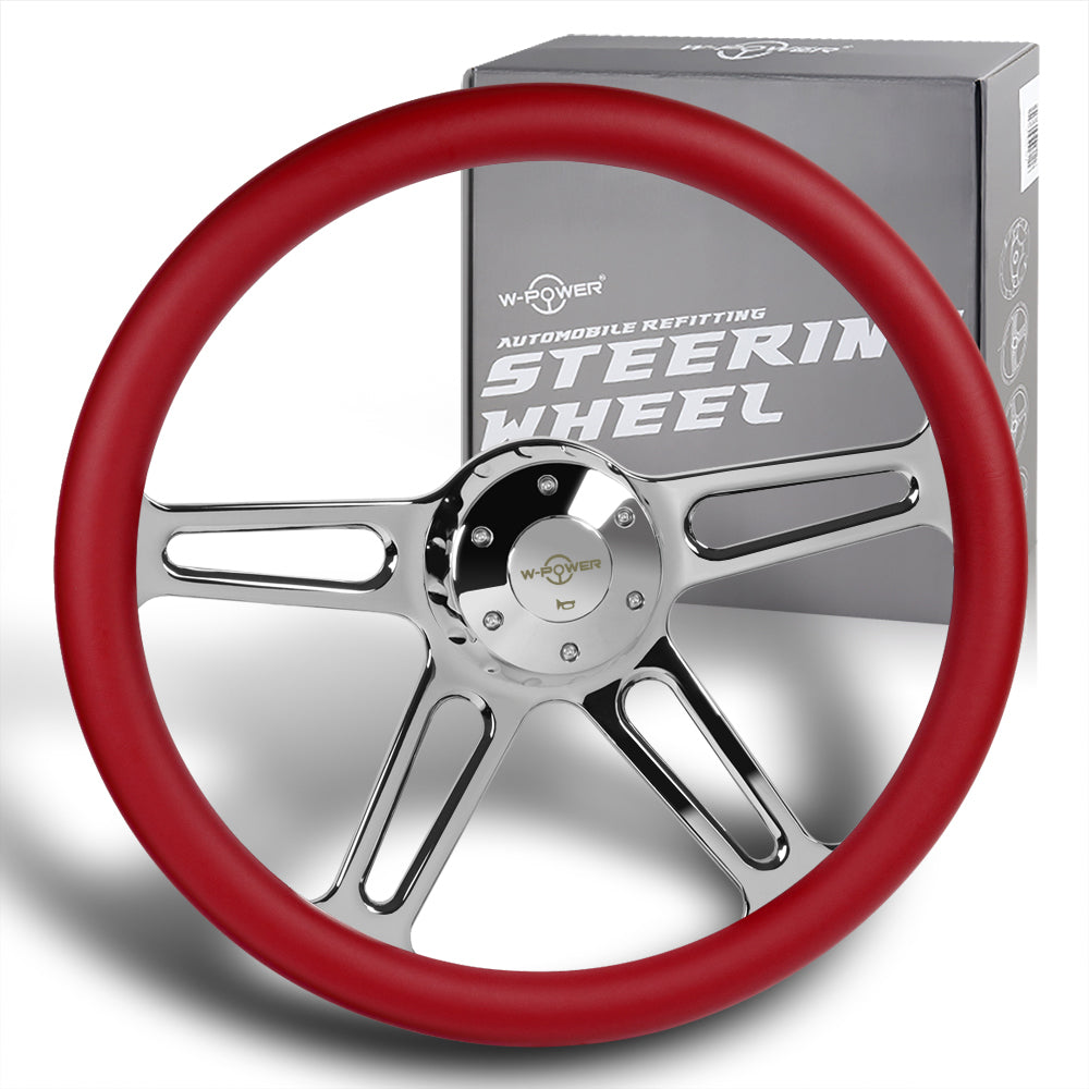 W-Power 18" 457mm 5-Bolt Hole With Aluminum Finished 4-Spoke Half Wrap Steering Wheel -Red Leather Grip/Chrome Center Spoke