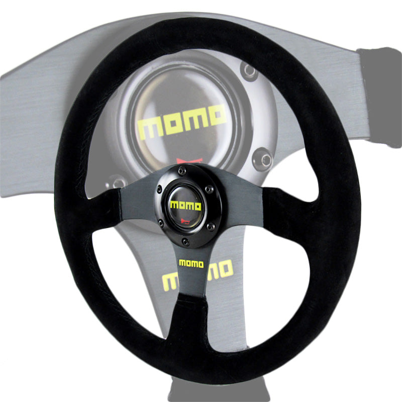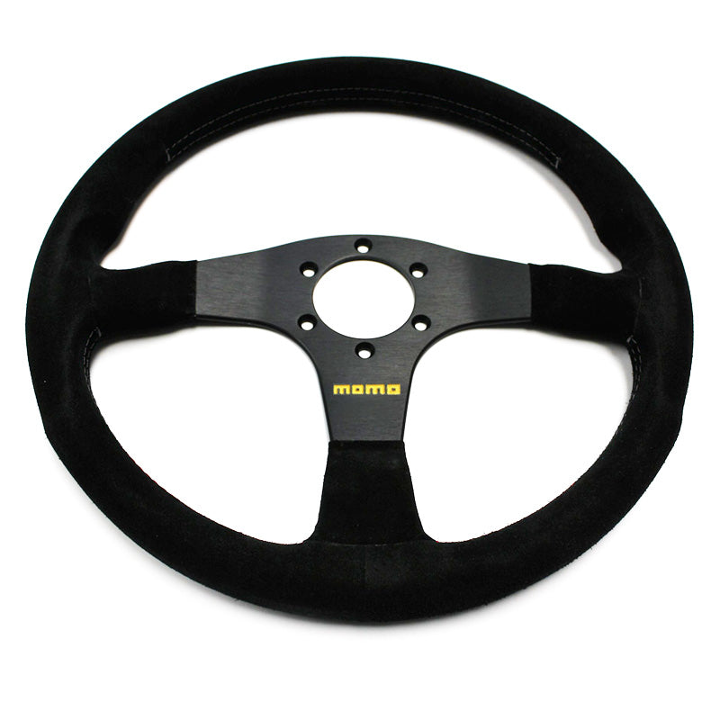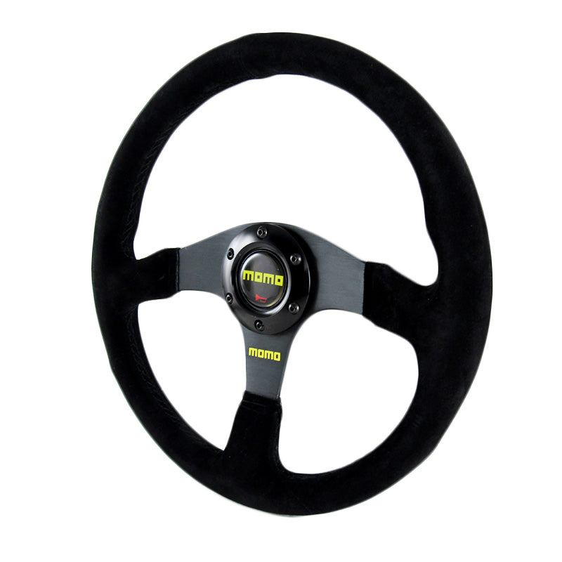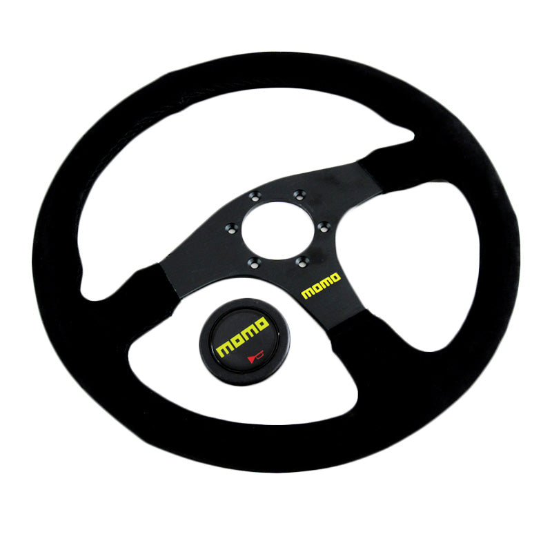 • Create an impression when passengers come on board your souped up vehicle with this 350mm MOMO style steering wheel. Its dished design complements its classy Black stitching. Made from genuine suede leather and light weight alloy for spoke. It will no doubt create an impression!