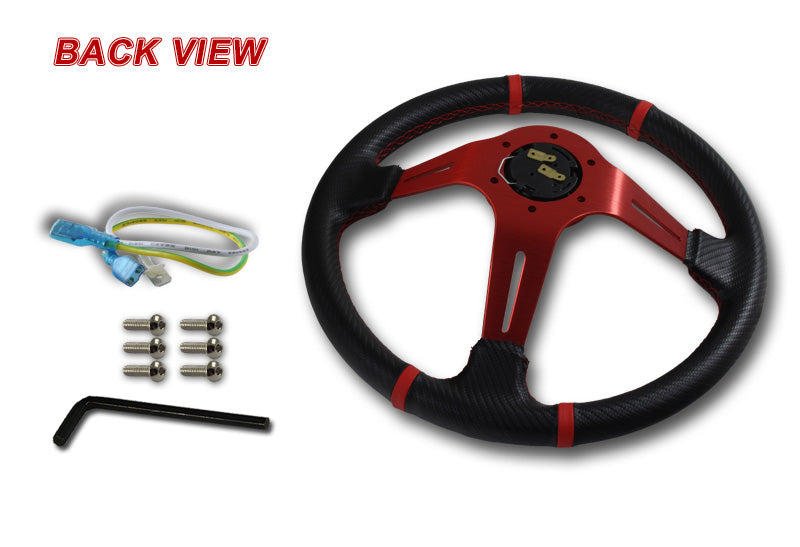 350mm 6-Bolt Hole Carbon Look PVC Leather Red Stitch Grip Deep Dish Red 3-Spoke Drift Style Steering Wheel