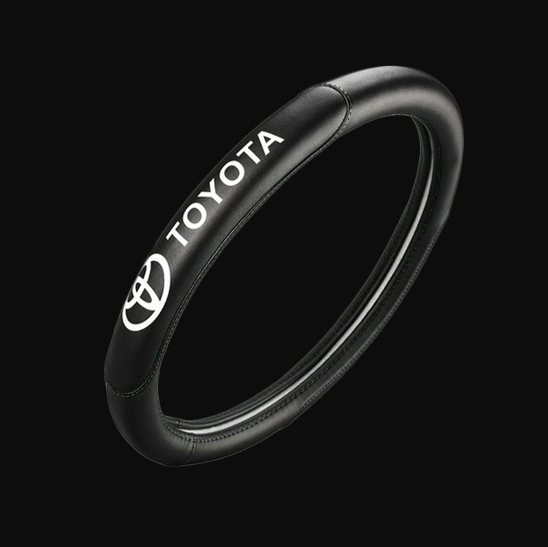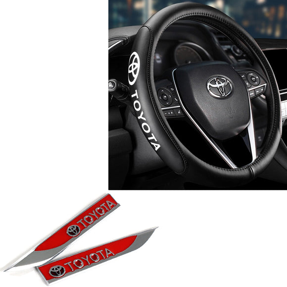 Toyota Set Genuine Leather Black 15" Diameter Car Auto Steering Wheel Cover with 3D Metal Emblems