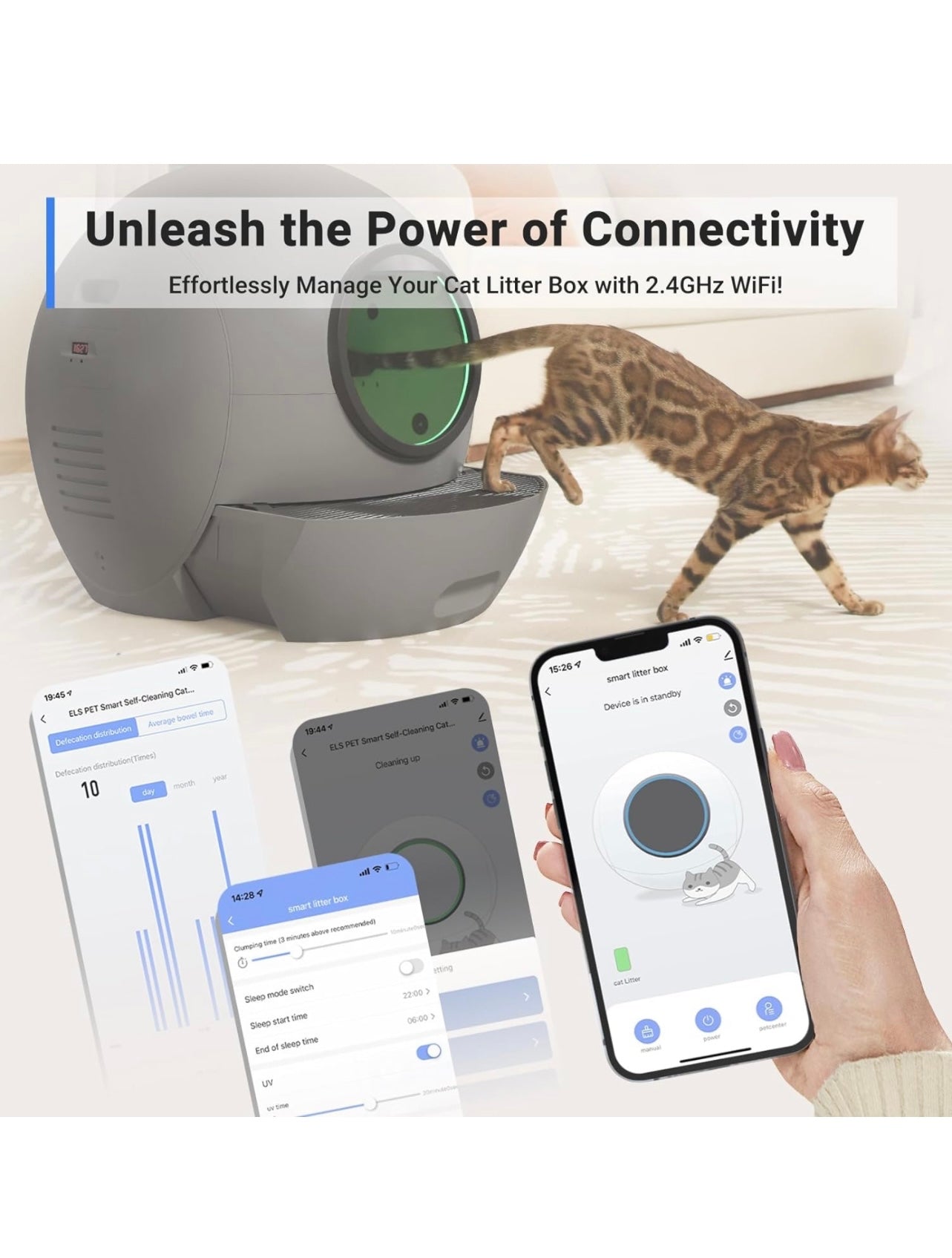 • Smart APP Control: Our self-cleaning cat litter boxes can connect to Wi-Fi(2.4 GHz only), allowing cat owners to monitor and control the litter box from their smartphone. Cat owners can check on the litter box's cleaning status, and adjust cleaning settings. By offering Wi-Fi connectivity and smart features, a self-cleaning cat litter box can provide added convenience and control for cat owners, making the litter box experience even more hassle-free and customizable.