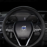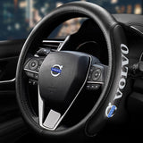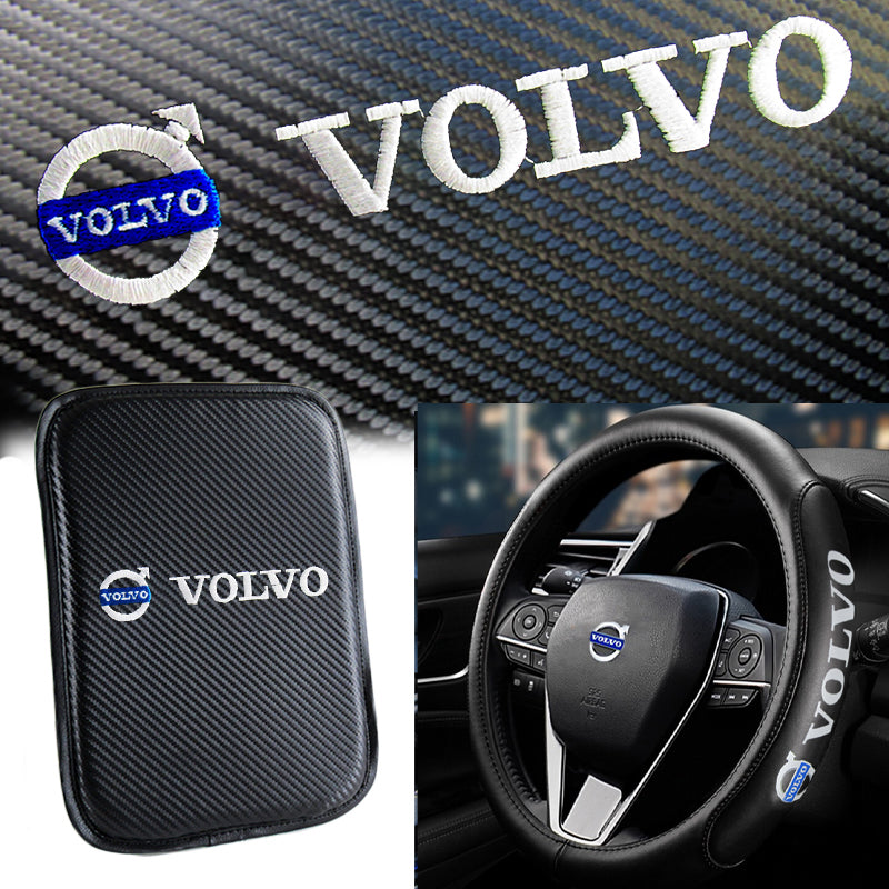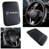 VOLVO Black 15" Diameter Car Auto Steering Wheel Cover Genuine Leather with Center Console Armrest Cushion Mat Pad Cover Stitched Embroidery Logo