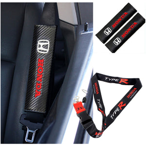 Honda Set Black Carbon Fiber Look Seat Belt Cover X2 with Type R Black Keychain Lanyard