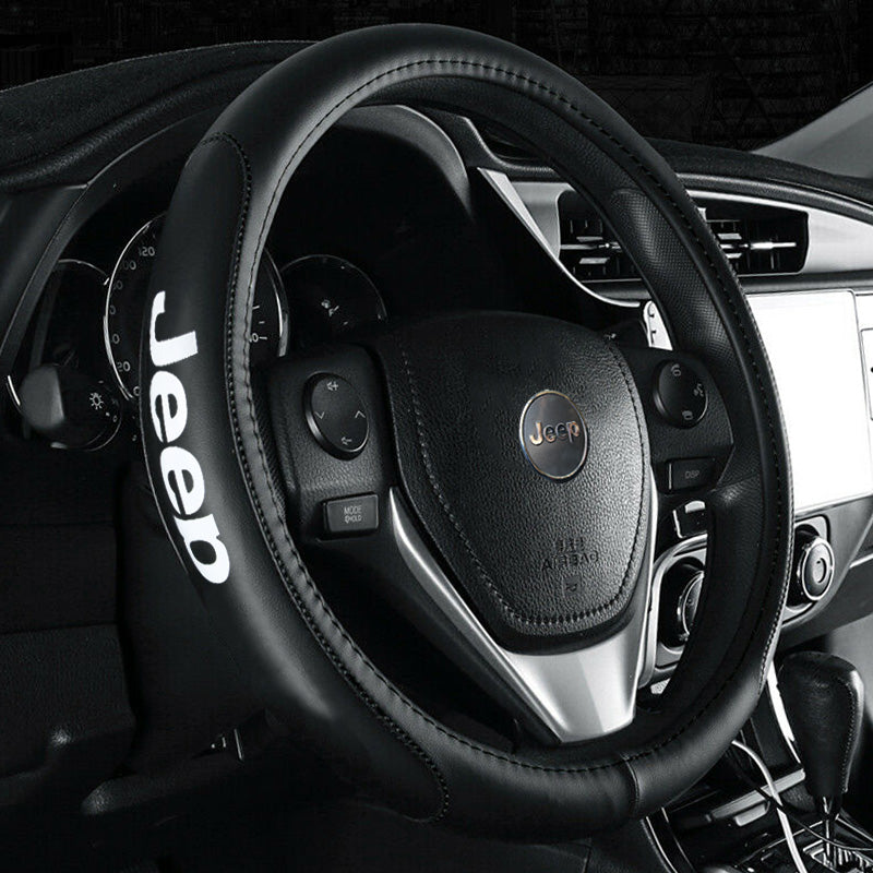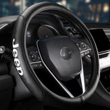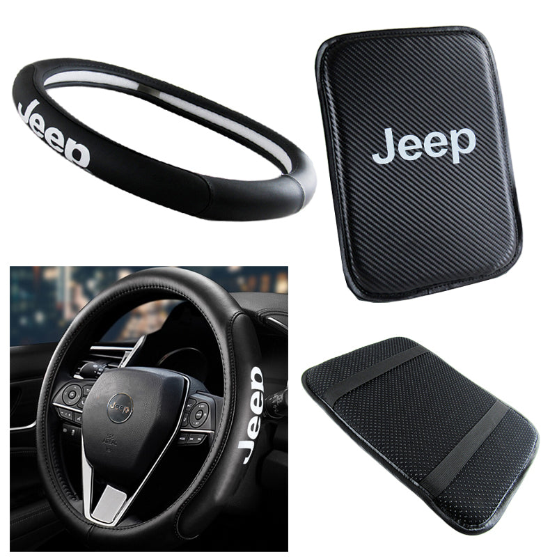 JEEP Set Black 15" Diameter Car Auto Steering Wheel Cover Quality Leather with Center Console Armrest Cushion Mat Pad Cover