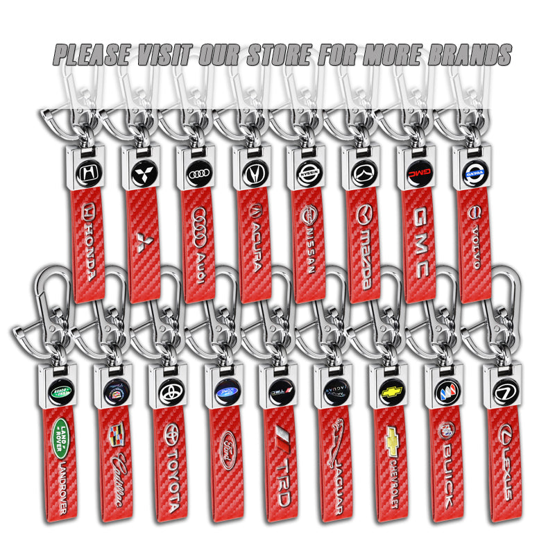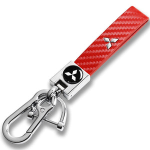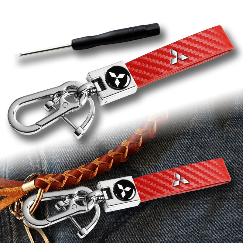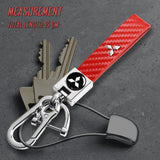 Mitsubishi Universal Chrome 3D Logo Carbon Fiber Look Red Leather Metal Gift Decor Quick Release Lanyard Keychain