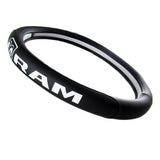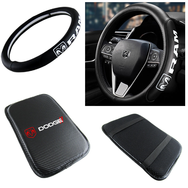 NEW DODGE RAM Set Black 15" Diameter Car Auto Steering Wheel Cover Quality Leather with Center Console Armrest Cushion Mat Pad Cover