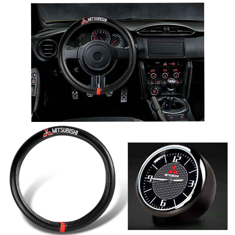 MITSUBISHI Set of Car 15" Steering Wheel Cover Carbon Fiber Look Leather with Exquisite Clock