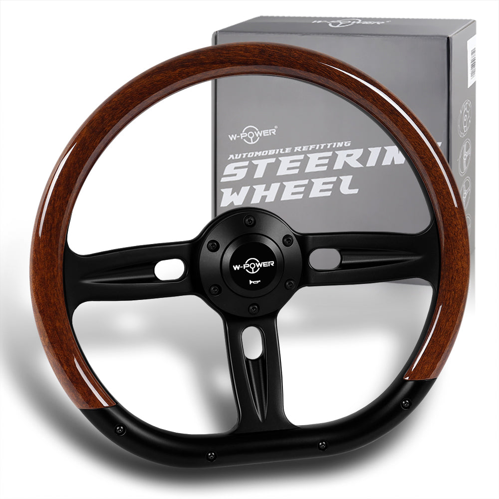 W-Power 14" 350mm 6-Bolt Hole Classic Brown Wood Half Wrap Grip With Aluminum Finished 3-Spoke Steering Wheel -Black Center Spoke