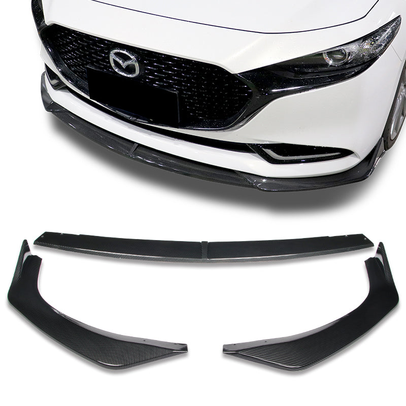 2019-2021 Mazda 3 Mazda3 Carbon Style 3-Piece Front Bumper Body Spoiler Splitter Lip Kit with Carbon Fiber Emblem