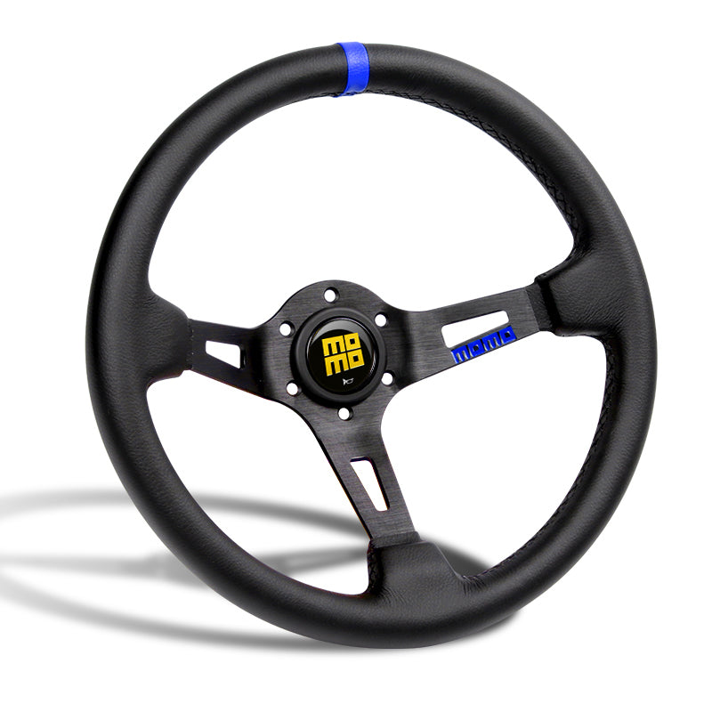 • Create an impression when passengers come on board your souped-up vehicle with this 350mm MOMO style steering wheel. Its Deep dished design complements its classy Black stitching. Made from genuine Microfiber leather and lightweight alloy for the spoke. It will no doubt create an impression!