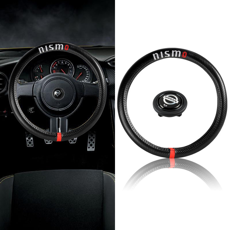 NISMO Nissan Set 15" Diameter Steering Wheel Cover Carbon Fiber Look Leather with LOGO Horn Button