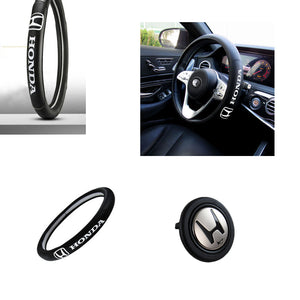 HONDA Set Quality Leather 15" Diameter Car Steering Wheel Cover with Black/GOLD JDM Horn Button