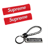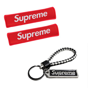 Supreme3M Set Embroidered Logo Red Seat Belt Covers with Black Metal Pendant with Calf Leather Keychain For Honda Toyota