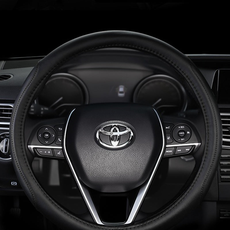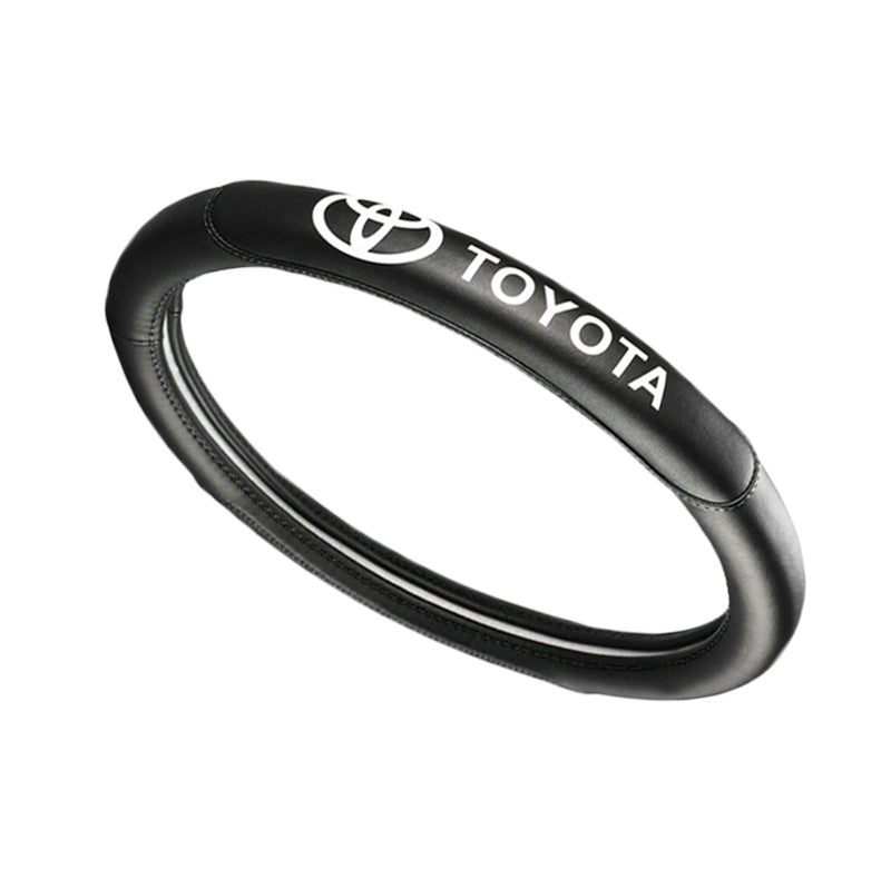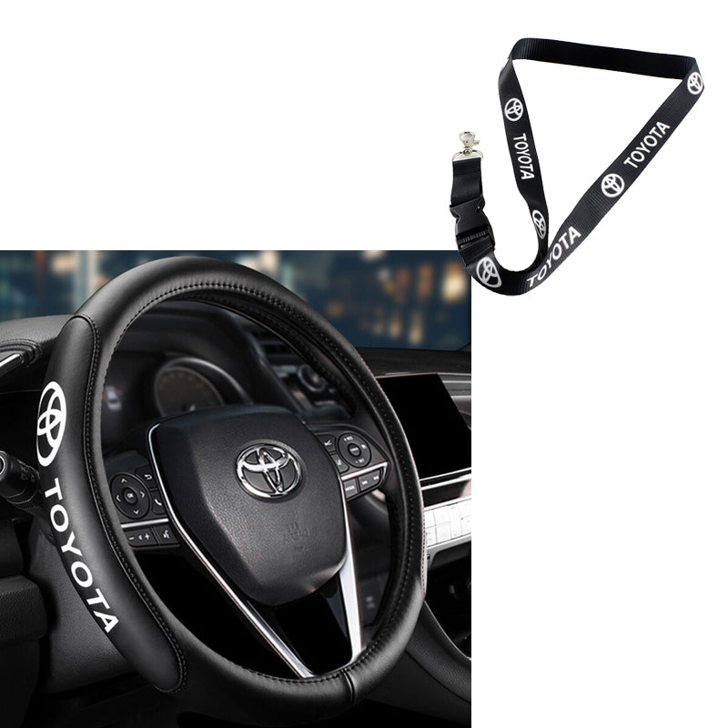 Toyota Black Set Genuine Leather 15" Diameter Car Auto Steering Wheel Cover with Keychain Lanyard