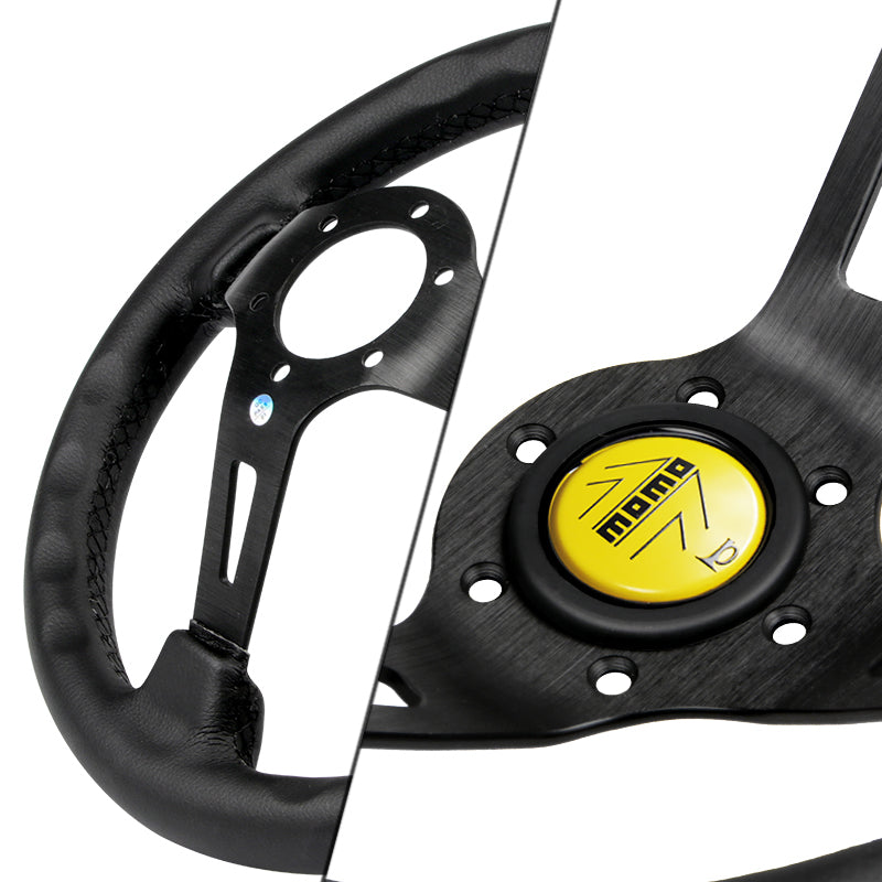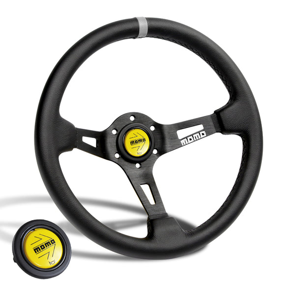 Create an impression when passengers come on board your souped-up vehicle with this 350mm MOMO style steering wheel. Its Deep dished design complements its classy Black stitching. Made from genuine Microfiber leather and lightweight alloy for the spoke. It will no doubt create an impression!