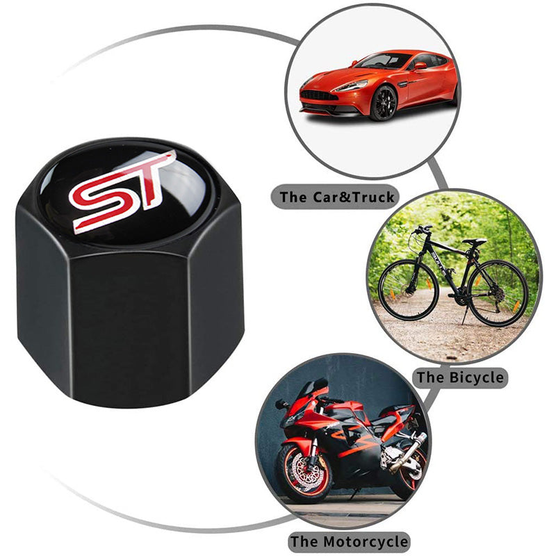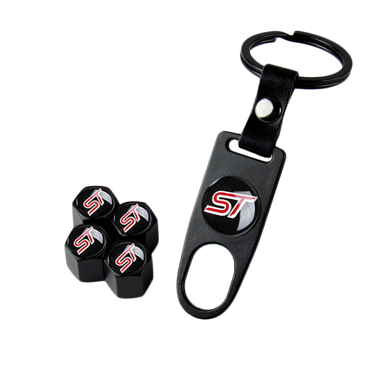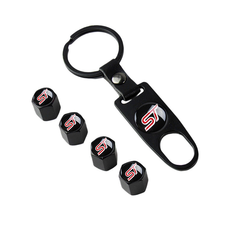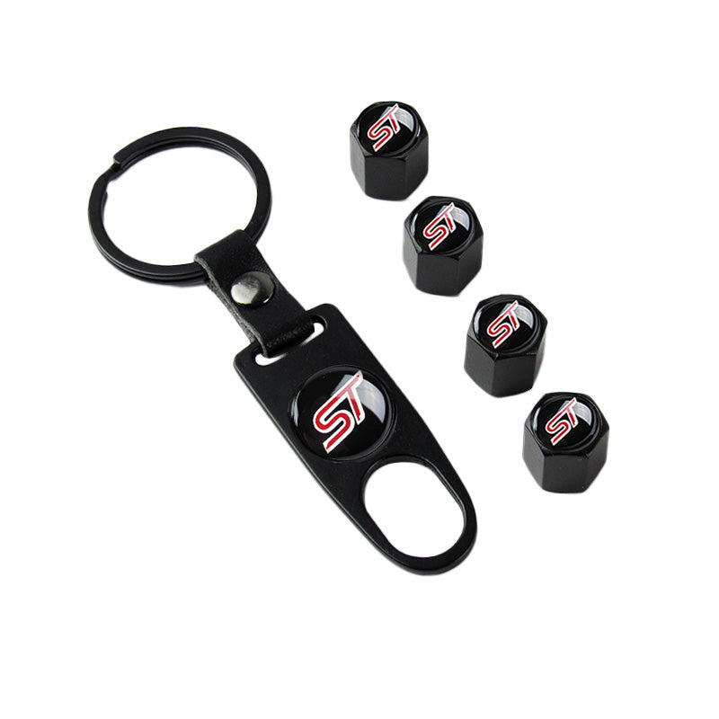 Ford FOCUS ST Universal Car SUV Wheel Tire Valves Dust Stem Air Caps Keychain Emblem Black Set