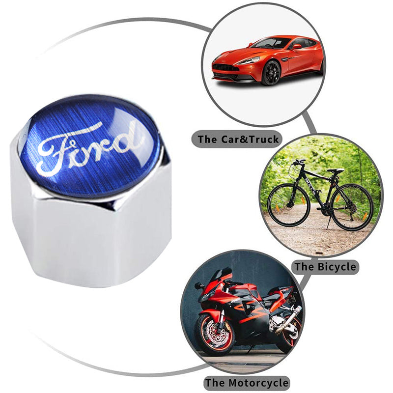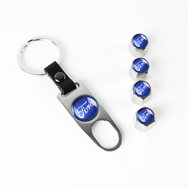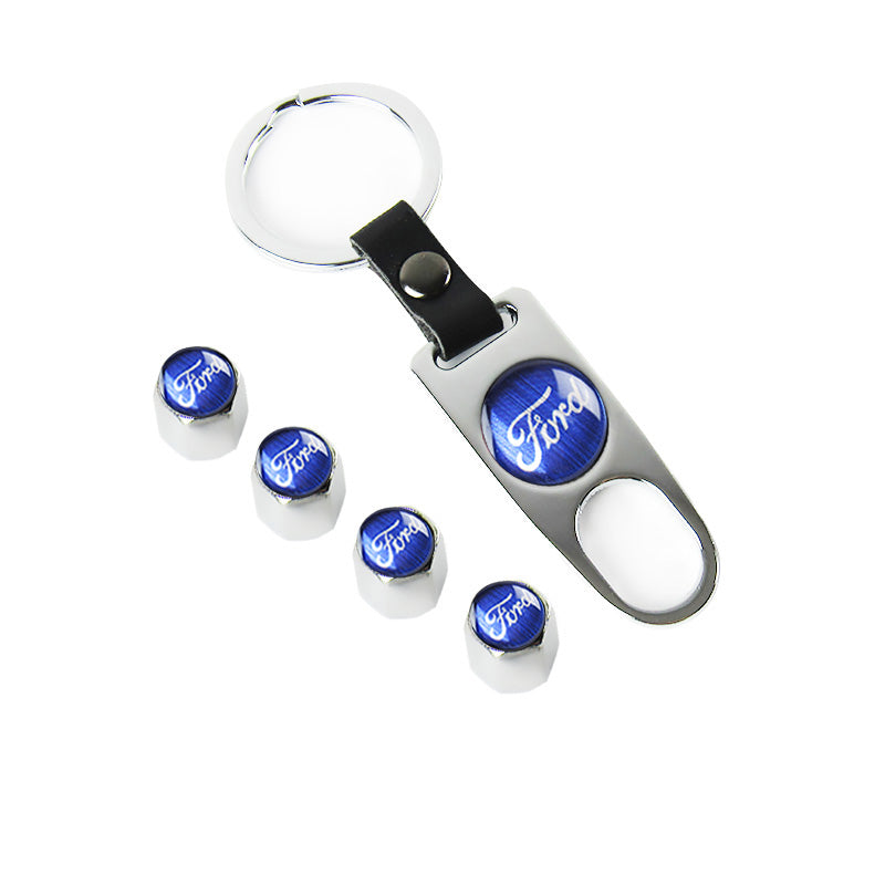 FORD Car Wheel Tire Valves Dust Stem Air Caps Keychain Emblem KEY FOB Silver Set - US SELLER