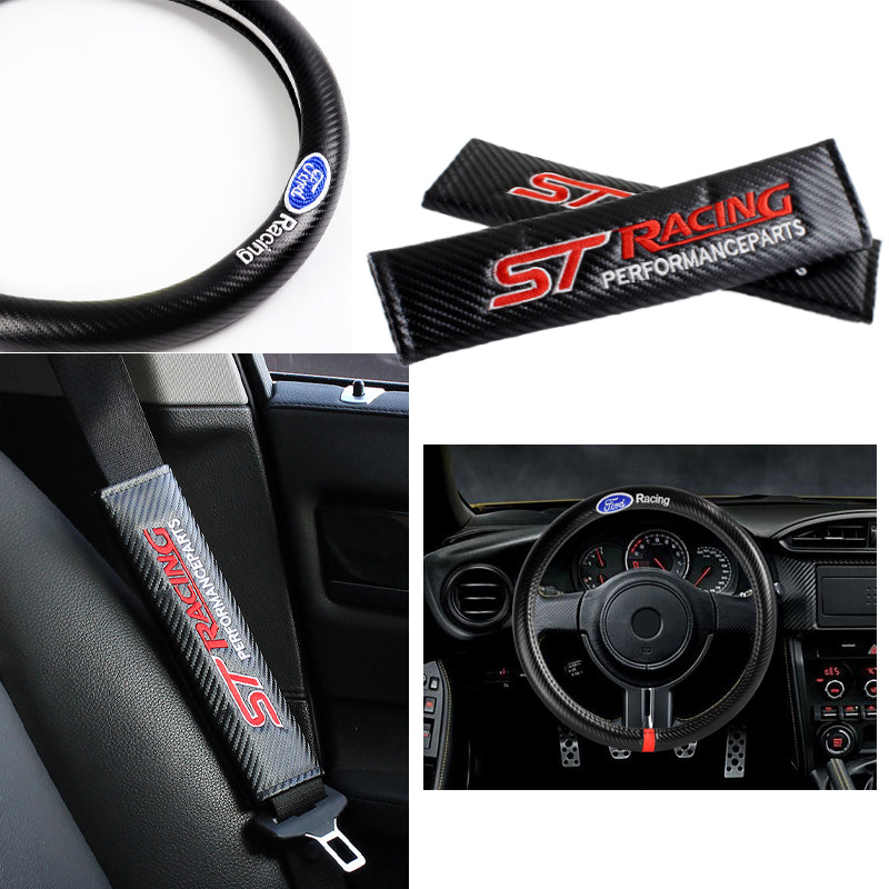 Ford ST RACING Set of Car 15" Steering Wheel Cover Carbon Fiber Style Leather with Seat Belt Covers