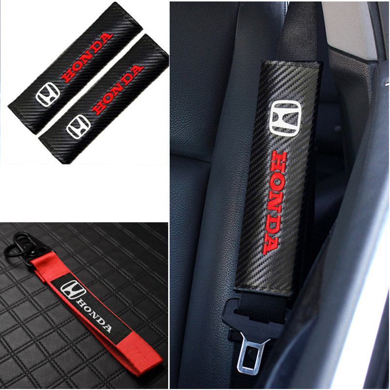 HONDA Set Universal ACCORD CIVIC Fit CR-V Carbon Fiber Look Seat Belt Cover with Red Metal Key Ring