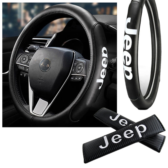 JEEP Set of Car 15" Steering Wheel Cover Quality Leather with Seat Belt Covers