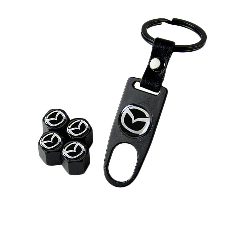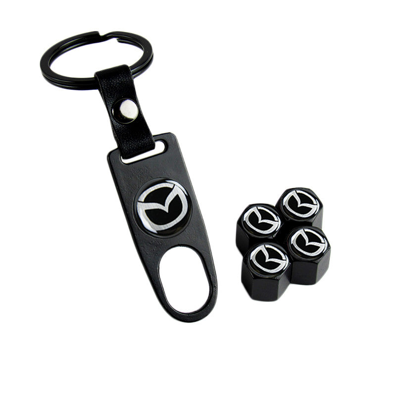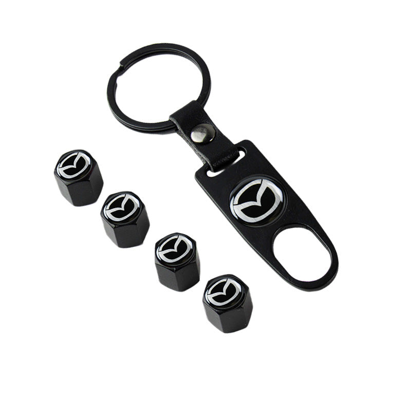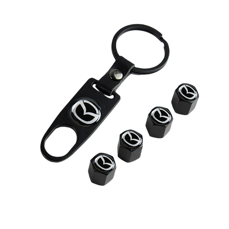 Mazda Universal Car SUV Wheel Tire Valves Dust Stem Air Caps Keychain Emblem Black Set