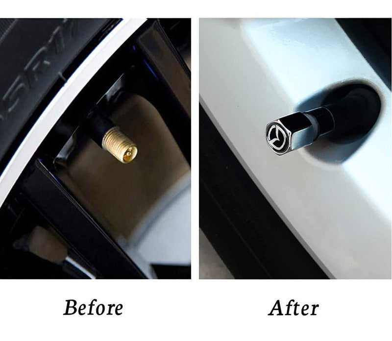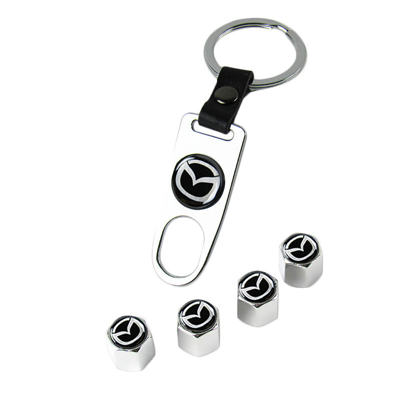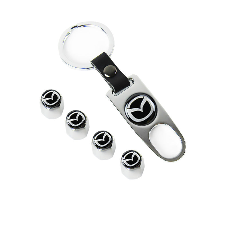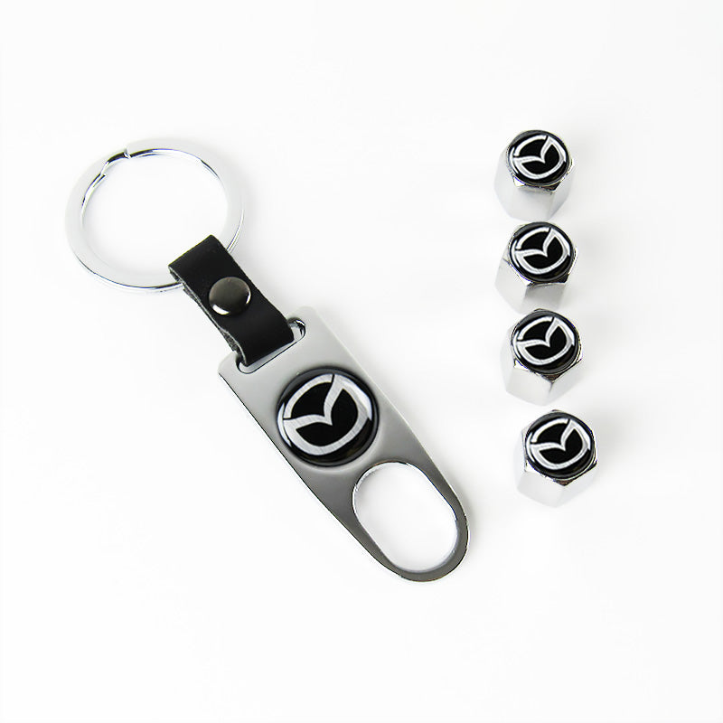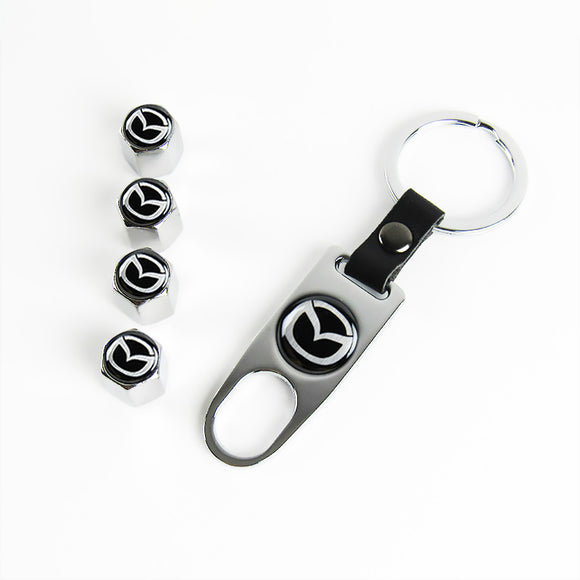 Mazda Universal Car SUV Wheel Tire Valves Dust Stem Air Caps Keychain Emblem Silver Set