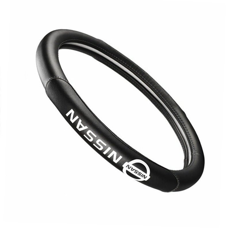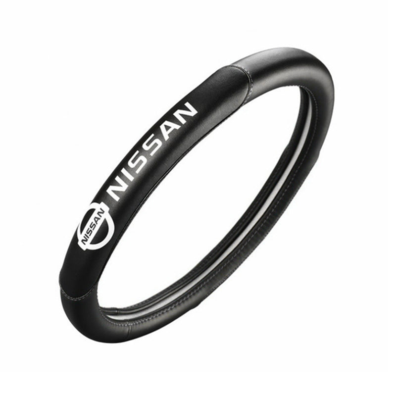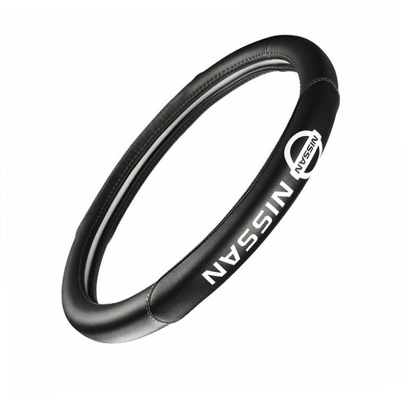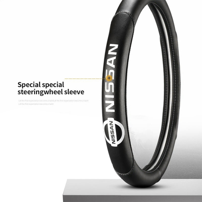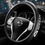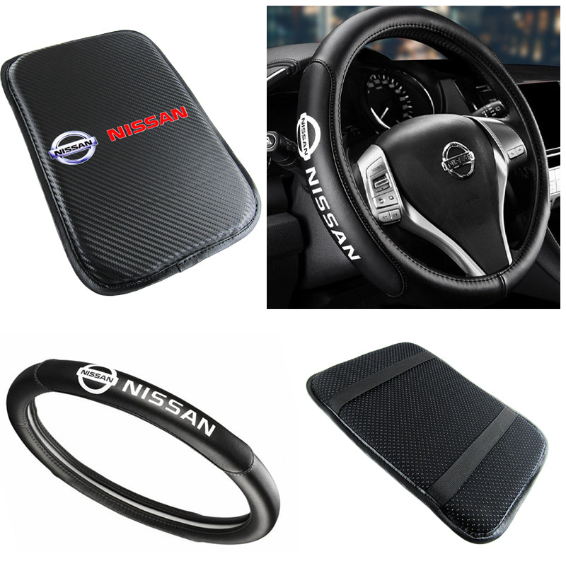 NISSAN Set Black 15" Diameter Car Auto Steering Wheel Cover Quality Leather with Center Console Armrest Cushion Mat Pad Cover