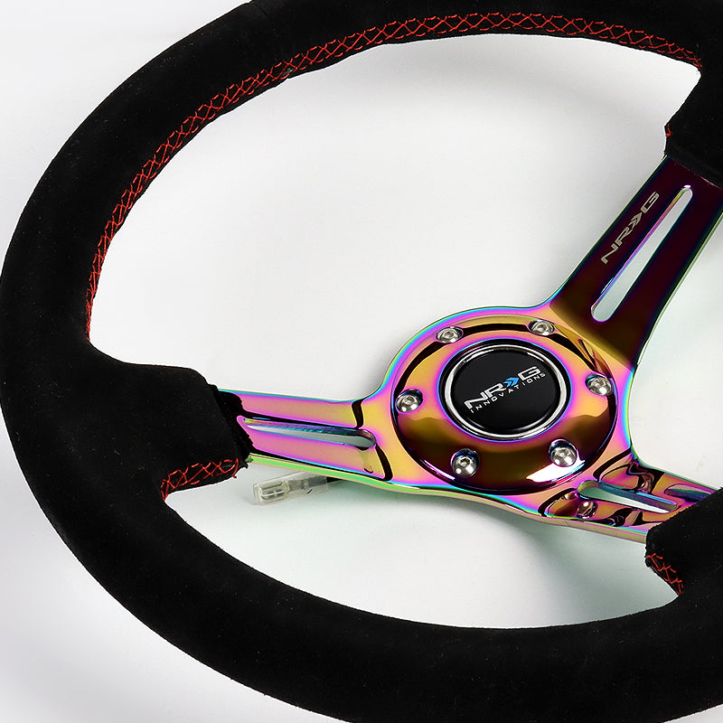 NRG 13.75" 350mm 6-Bolt Hole Black Suede Red Stitch Grip With Aluminum Finished 3-Spoke 3 Inch Deep Dish Steering Wheel RST-018S-MCRS-Neo Chrome Spoke