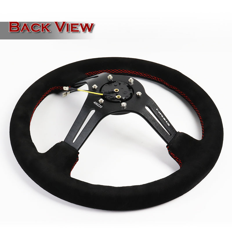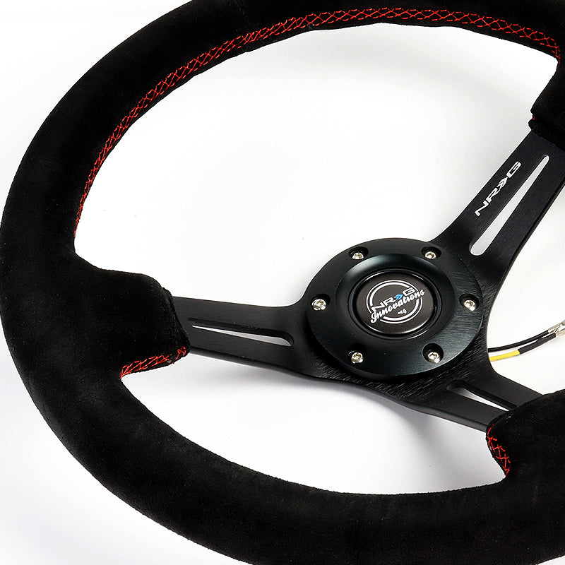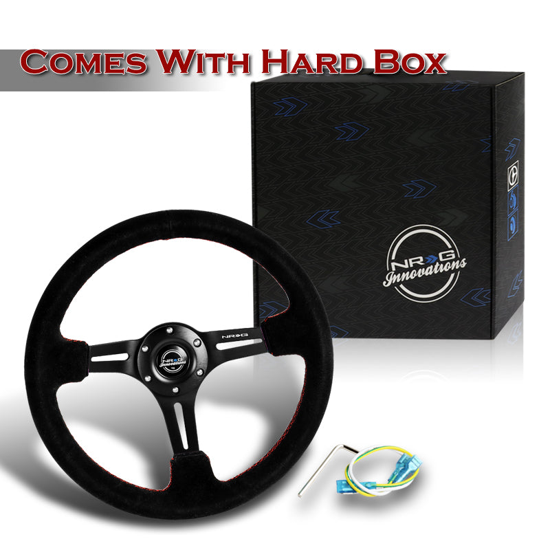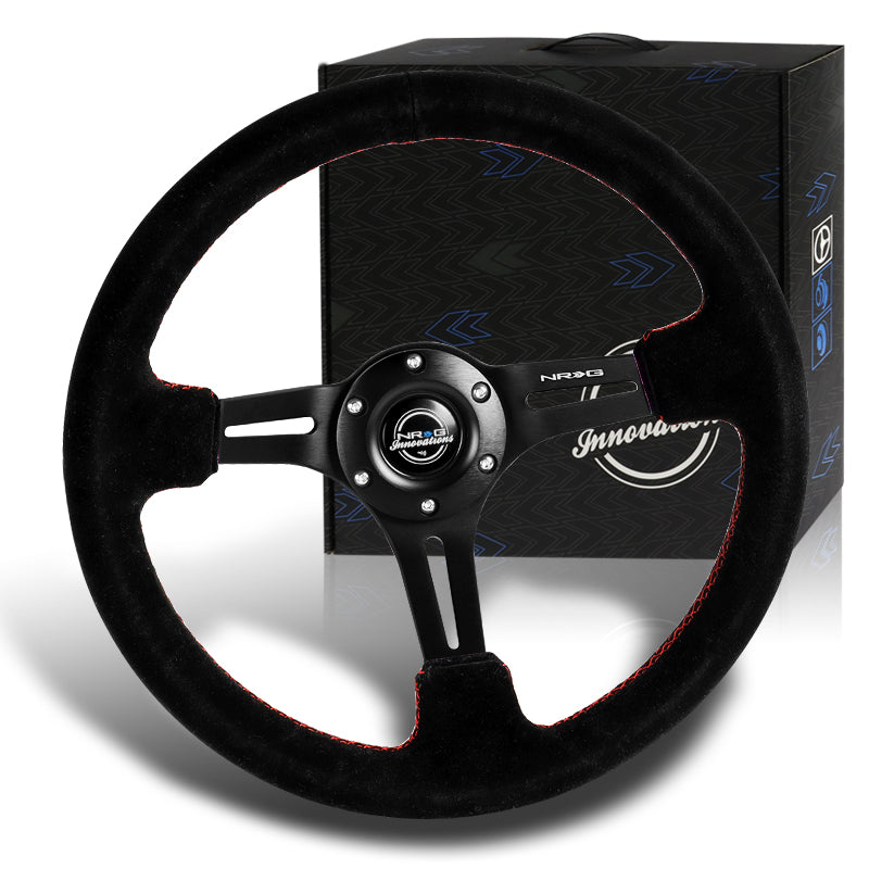 NRG 13.75" 350mm 6-Bolt Hole Black Suede Red Stitch Grip With Aluminum Finished 3-Spoke 3 Inch Deep Dish Steering Wheel RST-018S-RS -Black Spoke