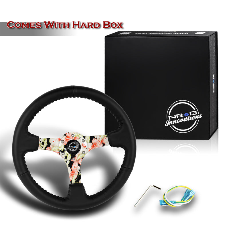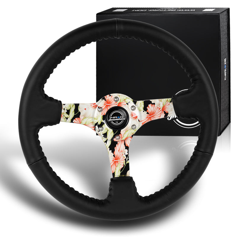 NRG 14" 350mm 6-Bolt Hole Black Leather Grip With Aluminum Finished 3-Spoke 3 Inch Deep Dish Steering Wheel RST-036FL-R -Hydro Dipped Floral Spoke