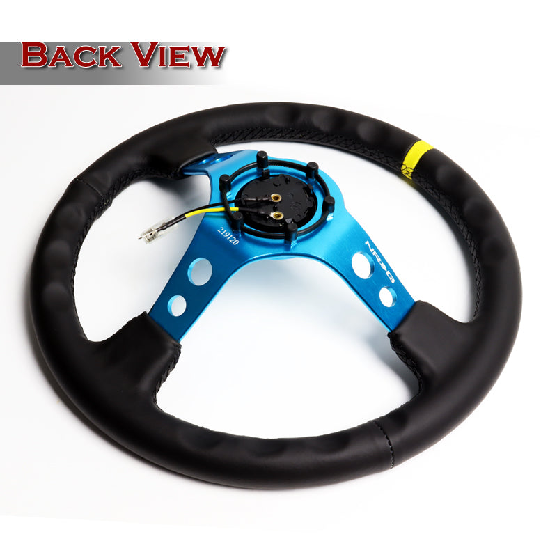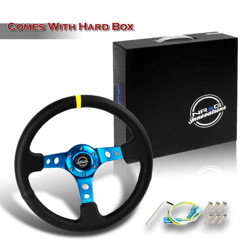NRG 14" 350mm 6-Bolt Hole Black Leather Yellow Stripe Grip With Aluminum Finished 3-Spoke 3.5 Inches Deep Dish Racing Steering Wheel RST-006BL-Y -Blue Center